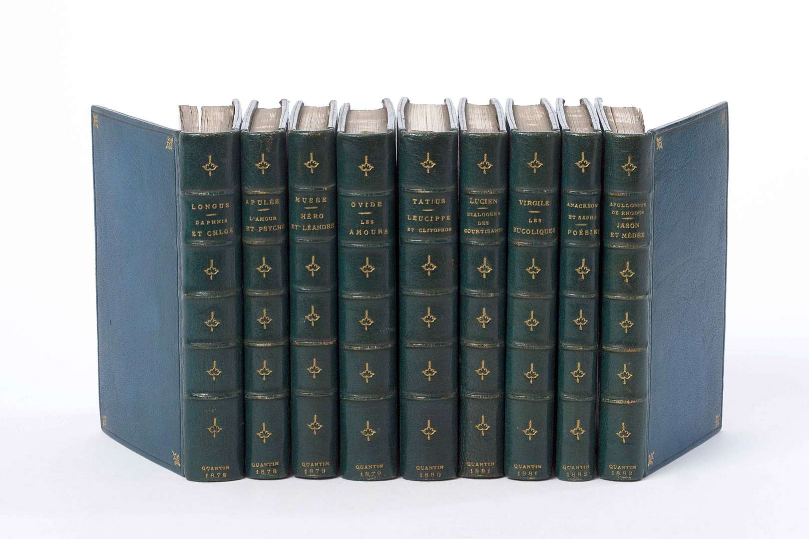[PETITS CHEFS-D'OEUVRE ANTIQUES (collection)] Réunion de 9 volumes de cette charmante collection illustrée publiée à Paris chez Quantin. In-16 (h = 14 cm.), reliure uniforme maroquin émeraude, dos à 5 nerfs, auteur, titre, éd., date et fleurons dorés, filet à froid en bordure et fleurons angulaires dorés aux plats, filet doré aux plats, dentelle intérieure, tête dorée, non rogné [Bourlier] (dos lég. foncés, qq. très légers frott.).