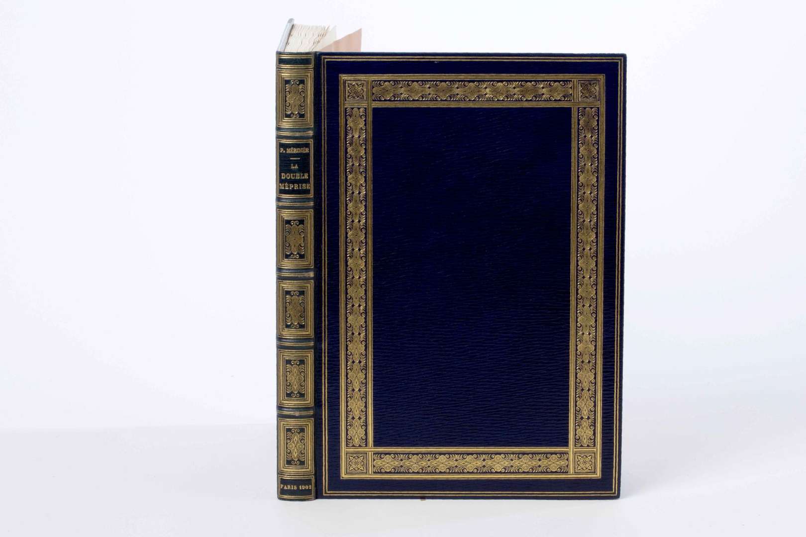 (le dernier blanc), maroquin à longs grains bleu marine, dos à 5 nerfs, auteur, titre, lieu et date dorés, caissons ornés, plats encadrés d'un double filet doré et ornés d'une large bordure de fers et filets dorés, filet doré aux coupes, coins guillochés, contreplats doublés de maroquin décoré d'un jeu de filets et large roulette dorés, doublure et garde de satin moiré rose, couv. et dos conservés, tranches dorées sur témoins, étui [Chambolle-Duru] (légers frott. à l'étui).