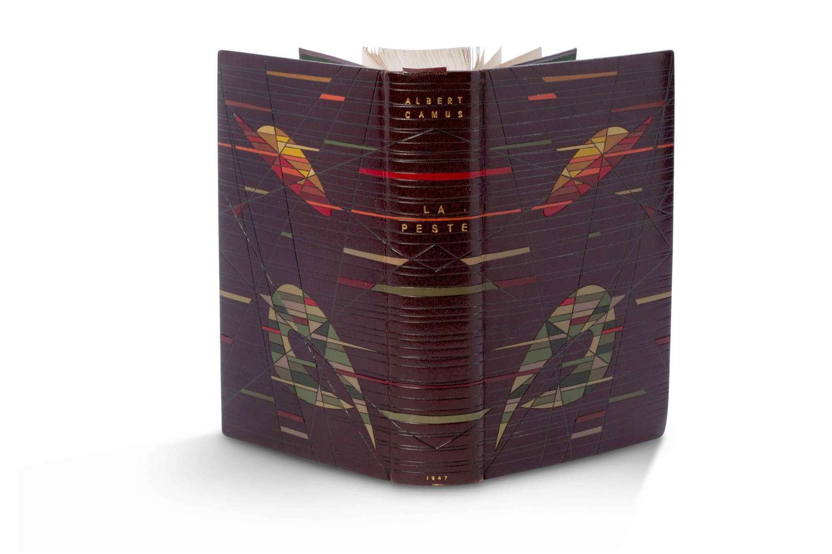 Paris, Gallimard, 1947. In-12, maroquin brun, dos lisse portant auteur, titre et date dorés, décor étendu au dos et aux plats, composé d'un jeu de filets à froid, et de listels et pièces géométriques mosaïqués, doublure et gardes daim vert bordées de maroquin, couvertures et dos conservés, tranches dorées sur témoins, chemise et étuis assortis [P. Bonet] (accroc à la coiffe de tête, dos de la chemise passé, petits frott. à l'étui).
