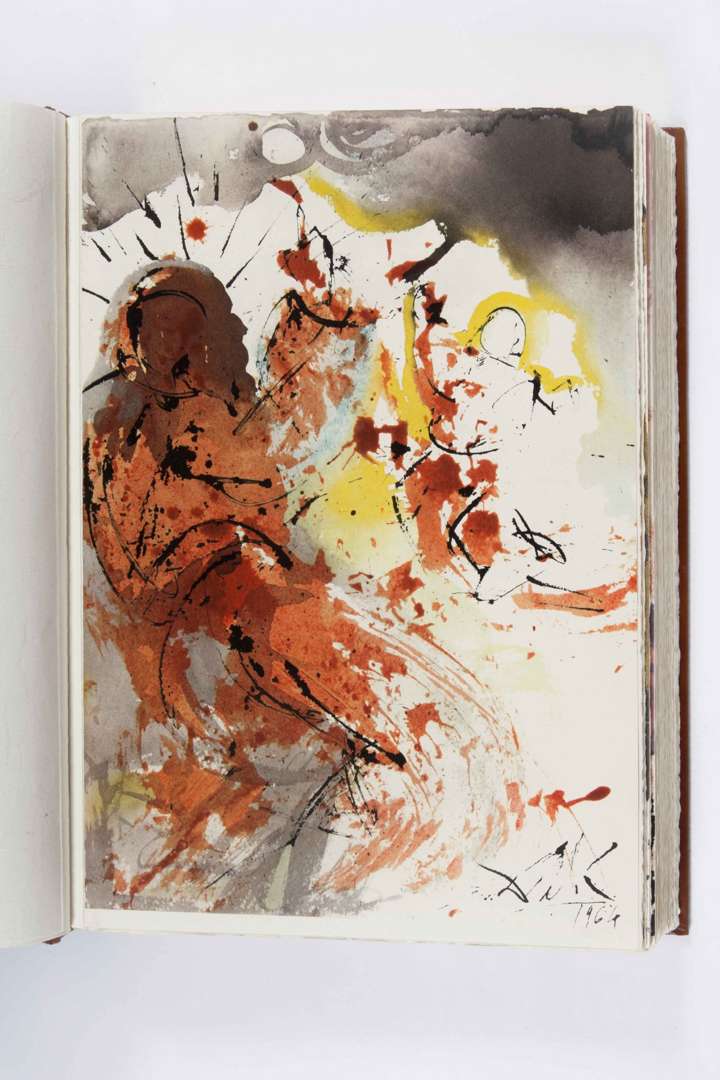 Édition spectaculaire du texte de la Vulgate, illustrée de 105 lithographies en couleurs signées dans la planche d'après les peintures de Salvador Dali, et de grandes lettrines noires dans le texte.
