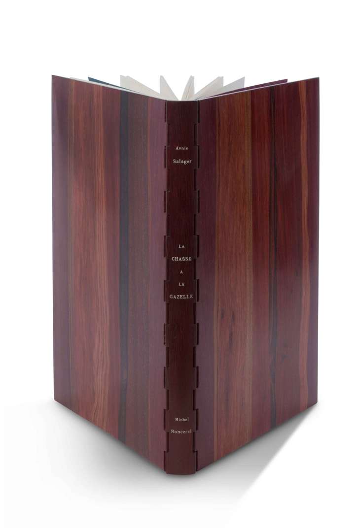 S.l., Manière Noire Editeur, 1999. In-4, reliure entièrement réalisée en bois, le dos y compris, noms d'auteur et titre en blanc, les plats formés d'un assemblage de teintes variées, non rogné, couv. et dos conservés, montage sur onglets, étui en bois assorti [A. Taral].