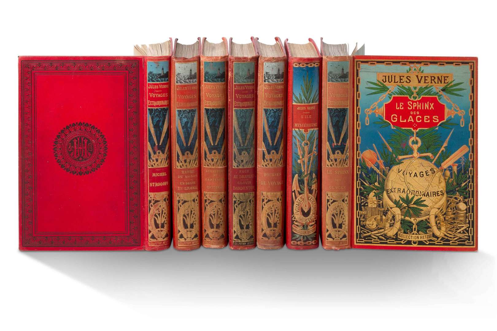 [LOT]. ENSEMBLE DE 7 VOLUMES DANS DES CARTONNAGES AU GLOBE DORÉ (6) ET À L'ANCRE (1)- VERNE (Jules), Bourses de voyage. Paris, Collection Hetzel, [1903-1904].