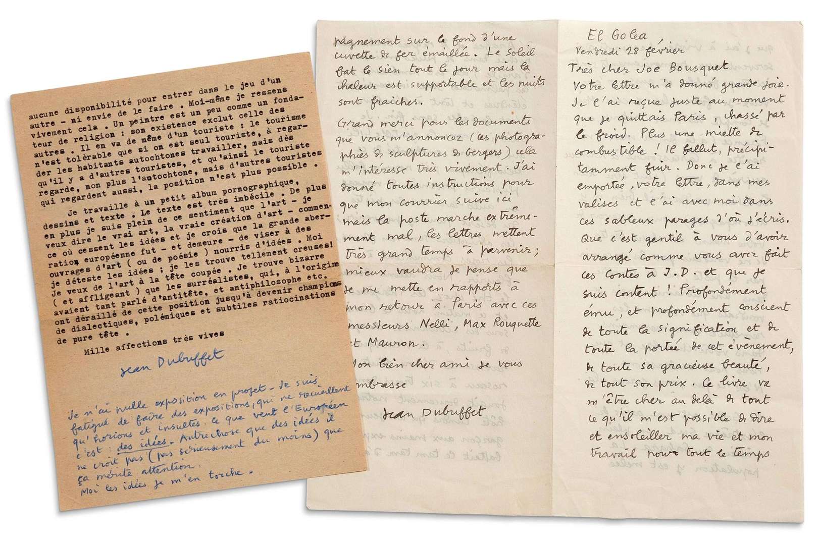 El Goléa 28 février [1948]. Il a quitté Paris, « chassé par le froid ». Il remercie Bousquet des contes qui lui sont dédiés [dans Le fruit dont l'ombre est la saveur]: « Ce livre va m'être cher au-delà de tout ce qu'il m'est possible de dire et ensoleiller ma vie et mon travail pour tout le temps que j'ai à vivre ». À son retour en France, il ira visiter