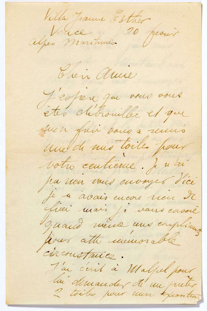 Il lui demande l'adresse de Malpel [Charles MALPEL (1874 - 1926), avocat, vituculteur et collectionneur] à Montauban pour lui « demander de me prêter 2 toiles pour une exposition », à moins qu'elle puisse lui demander « s'il voudrait me prêter la baignade et la petite Rue pavoisée »... Il ajoute:« vous savez que je suis toujours l'homme de la dernière heure »