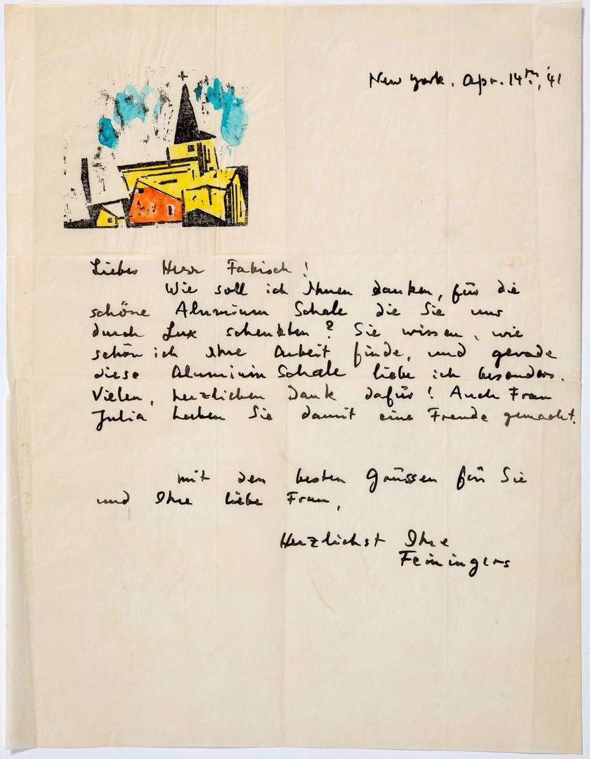 FEININGER Lyonel (1871 - 1856) L.A.S. « Feininger », New York 14 avril 1941, à Mr Fabisch| 1 page in-4, vignette gravée et coloriée en tête| en allemand.