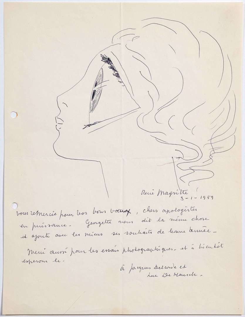 MAGRITTE René (1898-1967) L.A.S. « René Magritte » avec DESSIN, 3 janvier 1959, à Jacques DELCORDE et Luc De HEUSCH| 1 page in-4 (27,5 x 21 cm) au stylo-bille noir (plis légèrement marqués, 2 trous de classeur dans la marge).