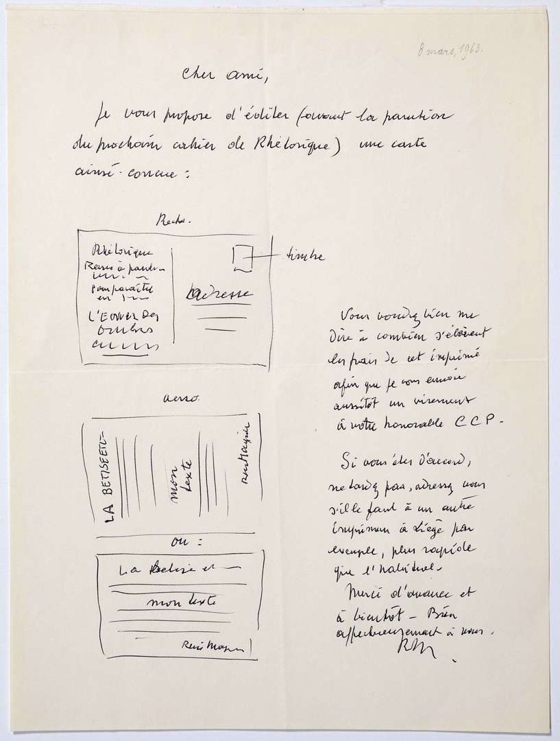 MAGRITTE René (1898-1967) L.A.S. »RM » avec 3 CROQUIS, [8 mars 1863], à son ami