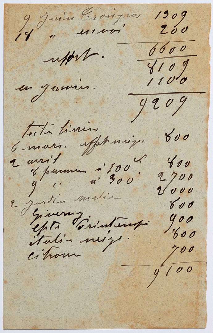 Comptes divers de dépenses, dont sommes dues à TROISGROS (marchand de toiles et chassis), pour un total de 9209. Suit la liste, avec prix, des « Toiles livrées » le 6 mars: Effet neige (800)| et le 2 avril: 8 panneaux à 100 (800), 9 à 300 (2700), 2 Jardin matin (2000), Giverny (800), Epte printemps (900), Italie neige (800), Citrons (700)| soit un total de 9100.