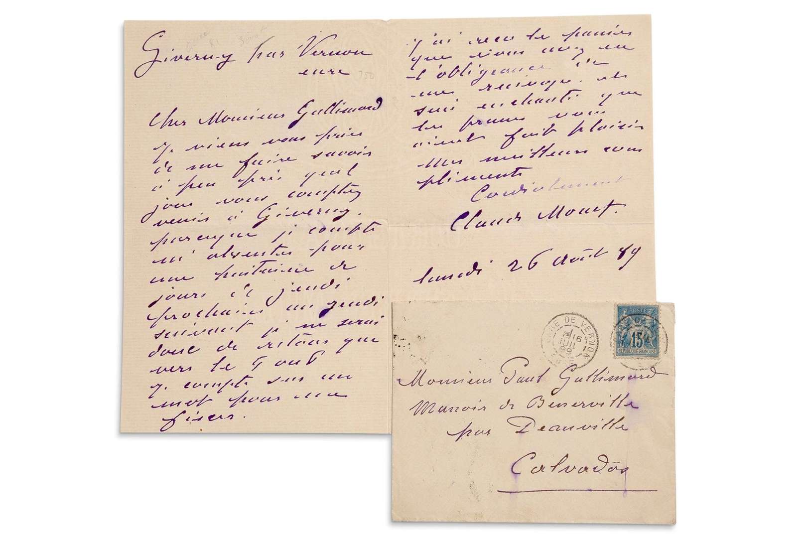 MONET Claude (1840 - 1926) L.A.S. « Claude Monet », Giverny 26 août 1889, à Paul GALLIMARD au manoir de Bénerville| 1 page et demie in-8| enveloppe.