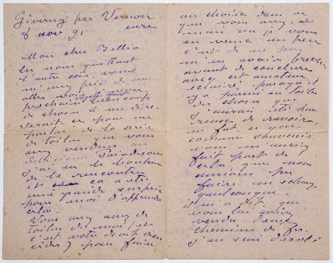 MONET Claude (1840 - 1926) L.A.S. « Claude Monet », Giverny 8 novembre 1891, à George de BELLIO| 4 pages in-8.