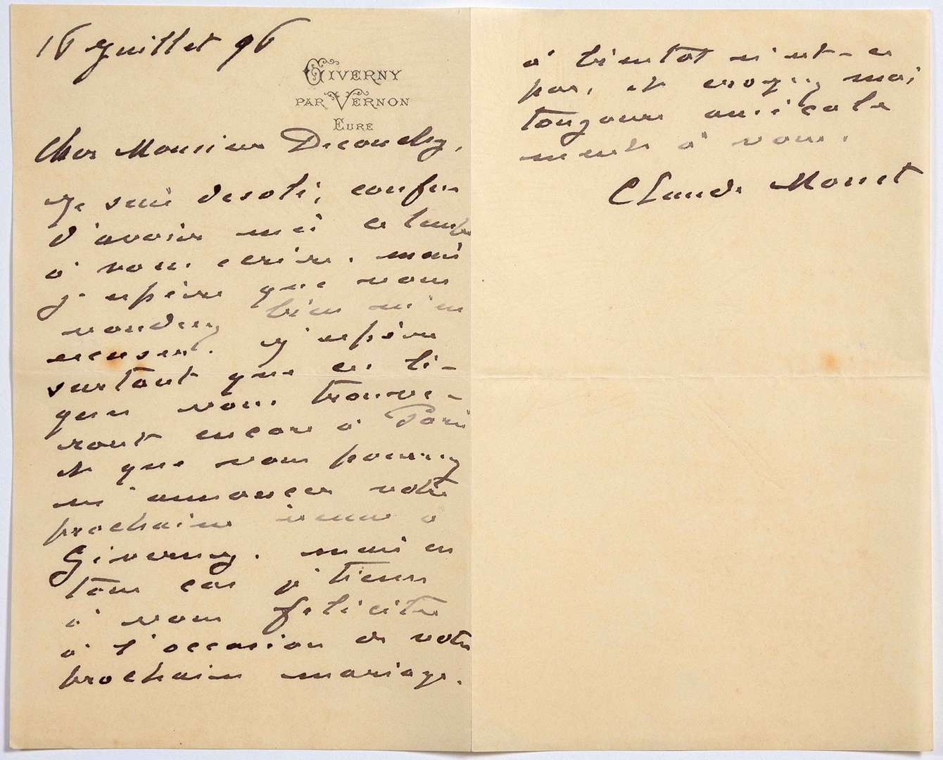 MONET Claude (1840 - 1926) L.A.S. « Claude Monet », Giverny 16 juillet 1896, à M. Decouchy| 1 page et quart in-8 à en-tête de Giverny.