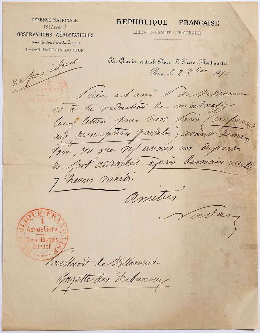 [Nadar a créé une Compagnie d'aérostiers pour la mise en place de la poste aérienne, depuis la butte Montmartre| il s'agit ici d'un des premiers vols qui quittent Paris.] « Prière à l'ami P. de Villeneuve et à sa rédaction de m'adresser leurs lettres pour hors Paris (conformément aux prescriptions postales) avant demain soir, vu que nous avons un départ de fort aerostat après demain matin 7 heures mardi »..