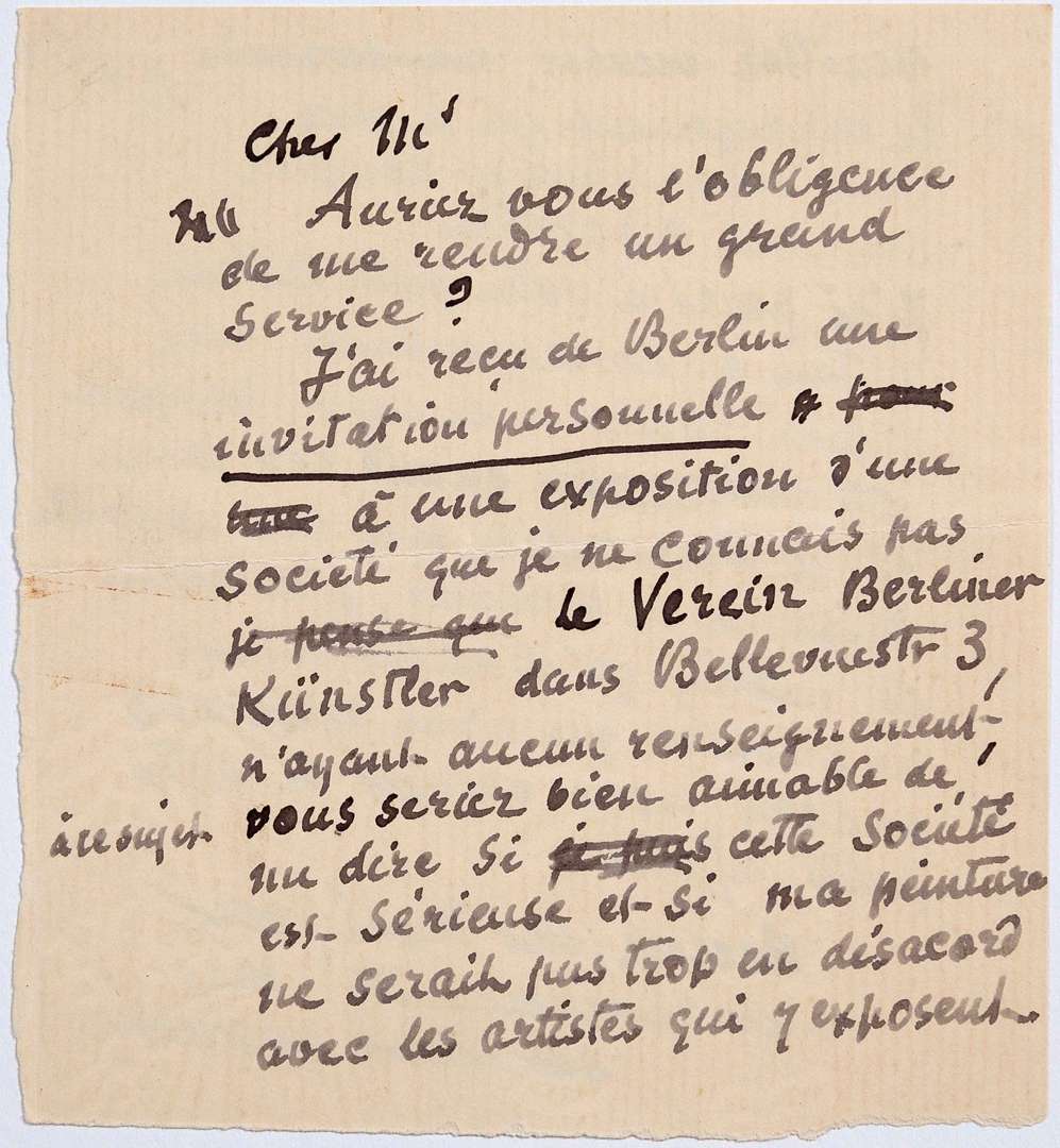 Il a reçu de Berlin « une invitation personnelle à une exposition d'une société que je ne connais pas le Verein Berliner Künstler dans Bellevuestr. 3. N'ayant aucun renseignement à ce sujet vous seriez bien aimable de me dire si cette société est sérieuse et si ma peinture ne serait pas trop en désaccord avec les artistes qui y exposent »... Il a pensé « à votre petit tableau », dont il a parlé avec Portier, qui est à nouveau alité suite à une nouvelle crise de sa maladie... Il espère qu'il ira bientôt mieux pour « nous occuper de notre petite affaire »... [Cette exposition organisée par l'Association des Artistes Berlinois eut lieu en 1892| elle fut la première de cette taille pour l'artiste, évènement qu'il qualifia lui-même de « sensation ».]