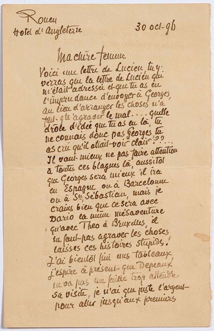 Barcelonne ou à Sn Sébastian, mais je crains bien que ce sera avec Dario [de REGOYOS] la même mésaventure qu'avec Théo [Van RYSSELBERGHE] à Bruxelles, il ne faut pas aggraver les choses, laisses ces histoires stupides. J'ai bientôt fini mes tableaux, j'espère à présent que DEPEAUX ne va pas me faire trop attendre sa visite, je n'ai que juste l'argent pour aller jusqu'aux premiers jours de la semaine prochaine. Je vais faire mes caisses et je les enverrai à Eragny ». Il doit se procurer une nouvelle seringue, la sienne s'étant cassée. « Voilà le temps au froid, le gros paletot, le jersey ne sont pas de trop »... [En 1896, Camille Pissarro effectue deux séjours à Rouen| il y réalisera notamment Les toits du vieux Rouen, temps gris.