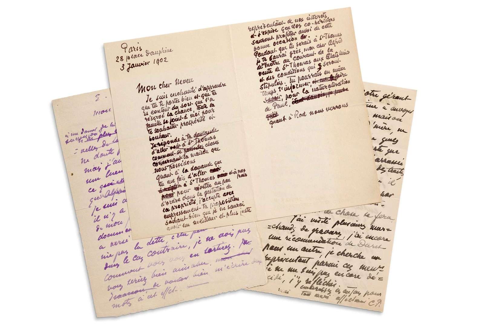 Paris 28 place Dauphine 3 janvier 1902. Brouillon autographe à son neveu Alfred, concernant la succession et la vente de la propriété familiale de Saint-Thomas. « Quant à la demande que tu me fais d'aller à St Thomas et à nos frais pour mettre un peu d'ordre dans la gestation de la propriété, j'accepte avec empressement ta proposition sachant bien que je ne saurais avoir un meilleur et plus juste représentant de nos intérêts et j'espère que nos cohéritiers sauront profiter aussi de cette bonne occasion. Pendant que tu serais à St Thomas je te saurai grés, mon cher Alfred de me mettre au courant de la vente de St Thomas aux États-Unis et des conditions qui seront stipulées »..