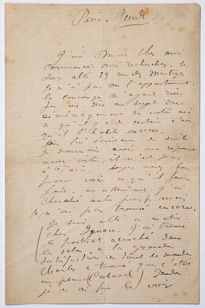 Il a commencé ses recherches d'appartement: « Je suis allé au 29 rue des Martyrs, je n'ai pas vu l'appartement, le concierge n'ayant rien pu me dire au sujet du déménagement de votre ami ce qu'il y a de certain, c'est qu'il l'habite encore »... Il cherche autre part en attendant mais n'a encore rien trouvé... Il est allé revoir un tableau: « Je suis allé ce matin chez Ignace. J'ai trouvé le portrait acroché dans le salon à la grande satisfaction de tout le monde. Charles a trouvé que c'était un peu... (Cabanel). [...] Les cailles sont arrivées à bon port et vous coûtent 75 centimes »..