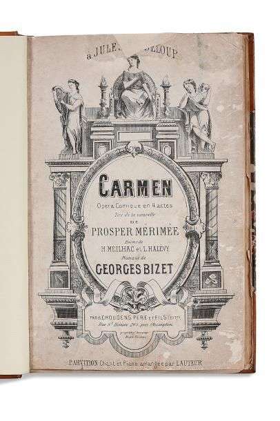 BIZET Georges (1838-1875). Carmen. Opéra Comique en 4 actes Tiré de la nouvelle de BIZET Georges (1838-1875). Carmen. Opéra Comique en 4 actes Tiré de la nouvelle de Prosper Mérimée. Poème de H. Meilhac et L. Halévy. Musique de Georges Bizet (Paris, Choudens Père et Fils, s.d. [1875]). In-4 de (4)-351 pp. (titre lithographié, catalogue des morceaux et musique imprimés) | reliure demi-basane fauve à coins (fortes rousseurs, accidents aux premier et dernier feuillets, réparations).