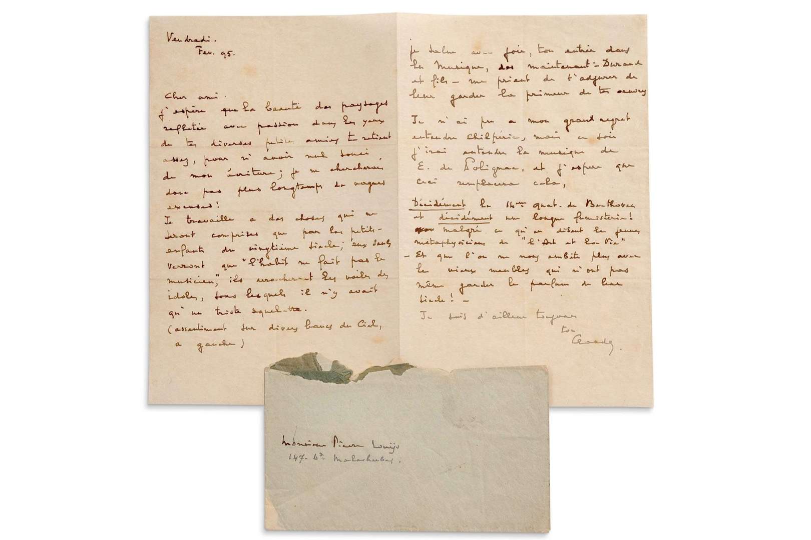 DEBUSSY Claude (1862 - 1918) L.A.S. « Claude », Vendredi [22] février 1895, à Pierre LOUŸS| 2 pages in-8, enveloppe.