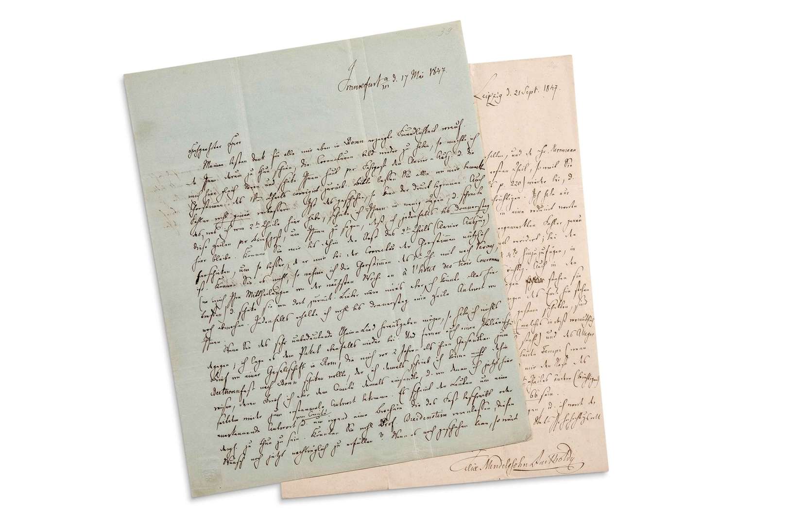 MENDELSSOHN Felix (1809 - 1847) 2 L.A.S. « Felix Mendelssohn Bartholdy », Frankfurt et Leipzig 17 mai et 21 septembre 1847, à l'éditeur N. SIMROCK à Bonn| 1 page et demie et 1 page in-4, adresses| en allemand.