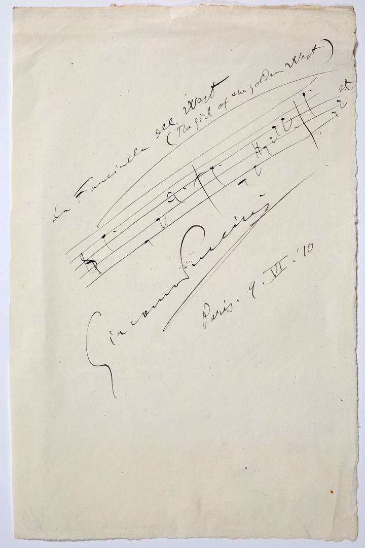 West (The Girl of the golden West) », la ligne de musique, puis signé et daté: « Giacomo Puccini Paris 9.VI.10 »