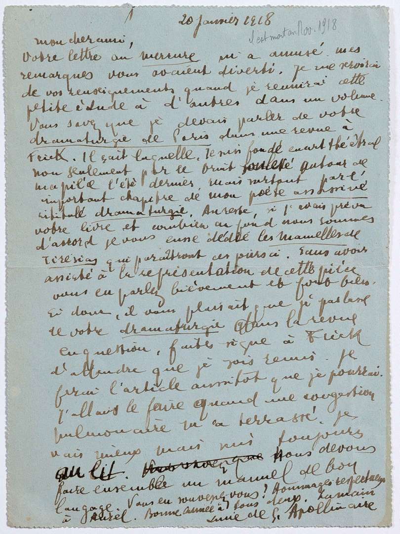 La lettre de Mortier l'a amusé: « mes remarques vous avaient diverti. Je me servirai de vos renseignements quand je réunirai cette petite étude à d'autres dans un volume ». Il devait parler de la Dramaturgie de Paris de Mortier « dans une revue à Frick. Il sait laquelle. Je suis fondé en art théâtral non seulement par le bruit soulevé autour de ma pièce [Les Mamelles de Tirésias], mais surtout par l'important chapitre de mon Poète assassiné intitulé dramaturgie. Au reste, si j'avais prévu votre livre et combien au fond nous sommes d'accord je vous eusse dédié les Mamelles de Tirésias qui paraîtront ces jours-ci. Sans avoir assisté à la représentation de cette pièce vous en parlerez brièvement et fort bien »... Il parlera volontiers de la Dramaturgie dans la revue de