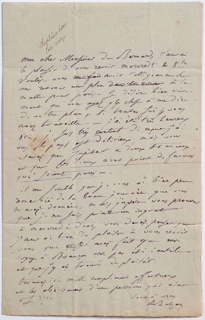 « Voulez-vous avoir l'obligeance de me retenir une place à la malle pour Paris - Je désire bien vivement que vous ayez qlq. chose à me dire de votre plan, si toutes fois vous avez travaillé. - J'ai été très heureux ici, je suis très content de ce que j'ai vu, le pays est délicieux, mais vous savez que Jupiter a deux tonneaux et que les dieux n'ont point de faveurs qui soient pures ».