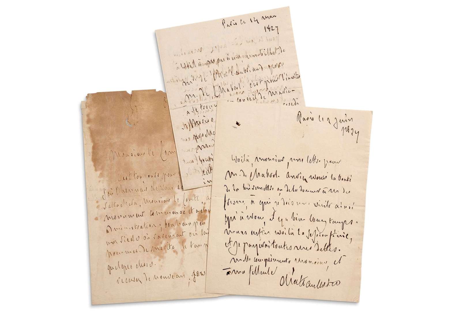 On joint une L.A.S. au comte de CHABROL, 4 janvier 1827 (forte mouillure, mauvais état)