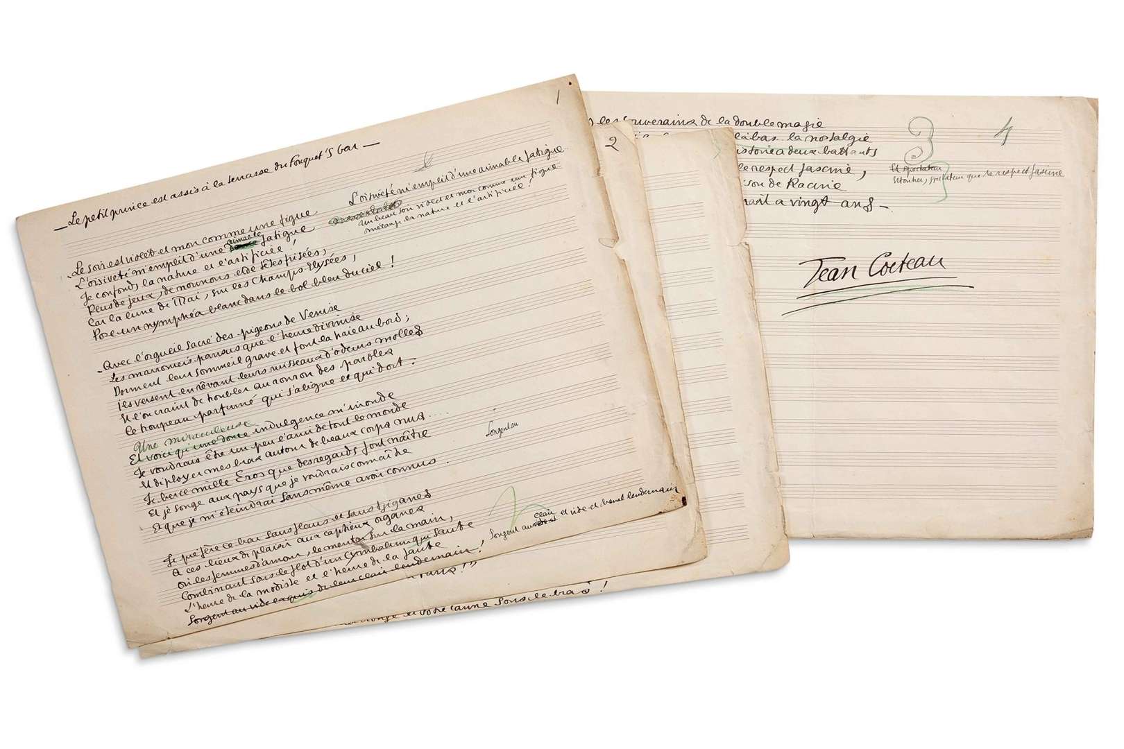 COCTEAU Jean (1889 - 1963) MANUSCRIT autographe signé « Jean Cocteau », Le petit prince est assis à la terrasse du Fouquet's bar, [1910 ?]| 4 pages oblong in-fol. (27 x 35 cm) de papier musique.