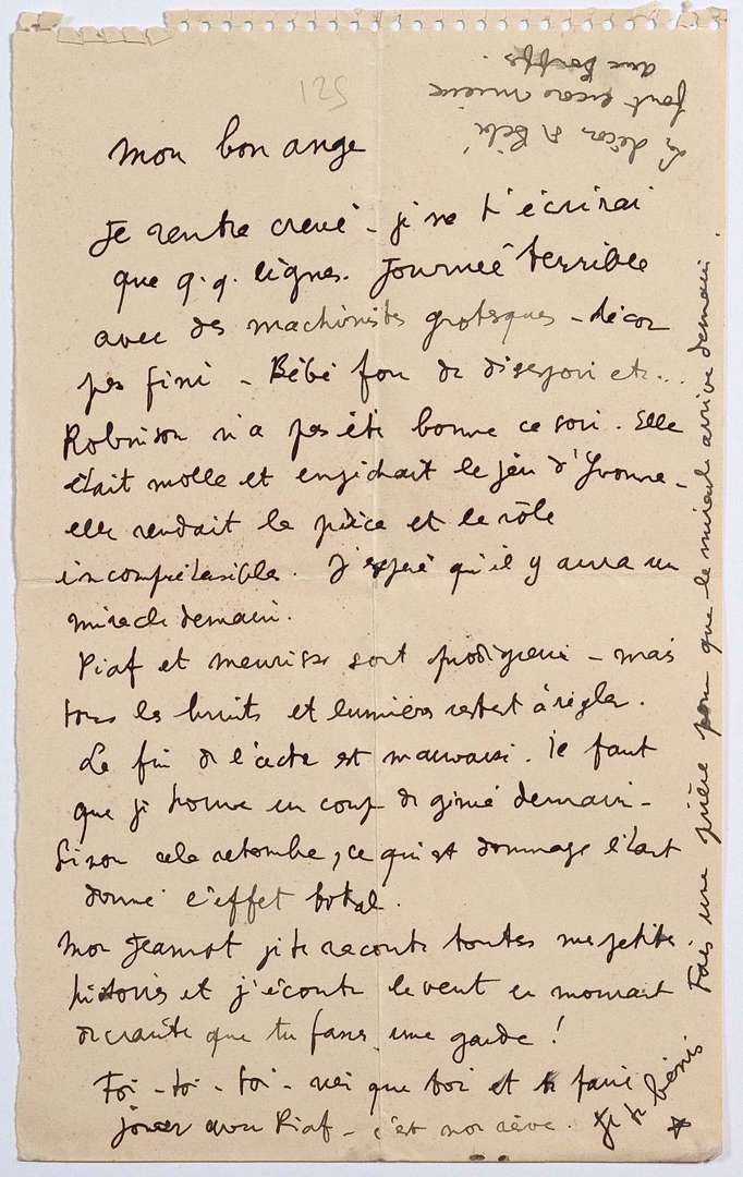 [La lettre a probablement été écrite le soir de la générale ou la veille de la première, le 20 avril 1940 au théâtre des Bouffes- Parisiens, de deux pièces de Cocteau: Le Bel Indifférent, pièce en un acte (monologue) avec Édith PIAF et Paul Meurisse, et Les