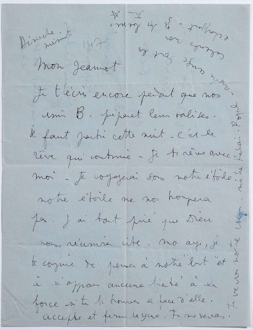 « Mon Jeannot Je t'écris encore pendant que nos amis B. [BERL] préparent leurs valises. Il faut partir cette nuit. C'est le rêve qui continue. Je te rêve avec moi. Je voyagerai sous notre étoile, notre étoile ne nous trompera pas. J'ai tant prié que Dieu nous réunira vite. Mon ange, je te conjure de penser à notre “but” et à n'opposer aucune fierté à la force si tu te trouves en face d'elle. Accepte et ferme les yeux. Tu me verras. Tu verras notre coeur - notre Palais- Royal - notre ange dont les calculs nous échappent. Je te bénis ».