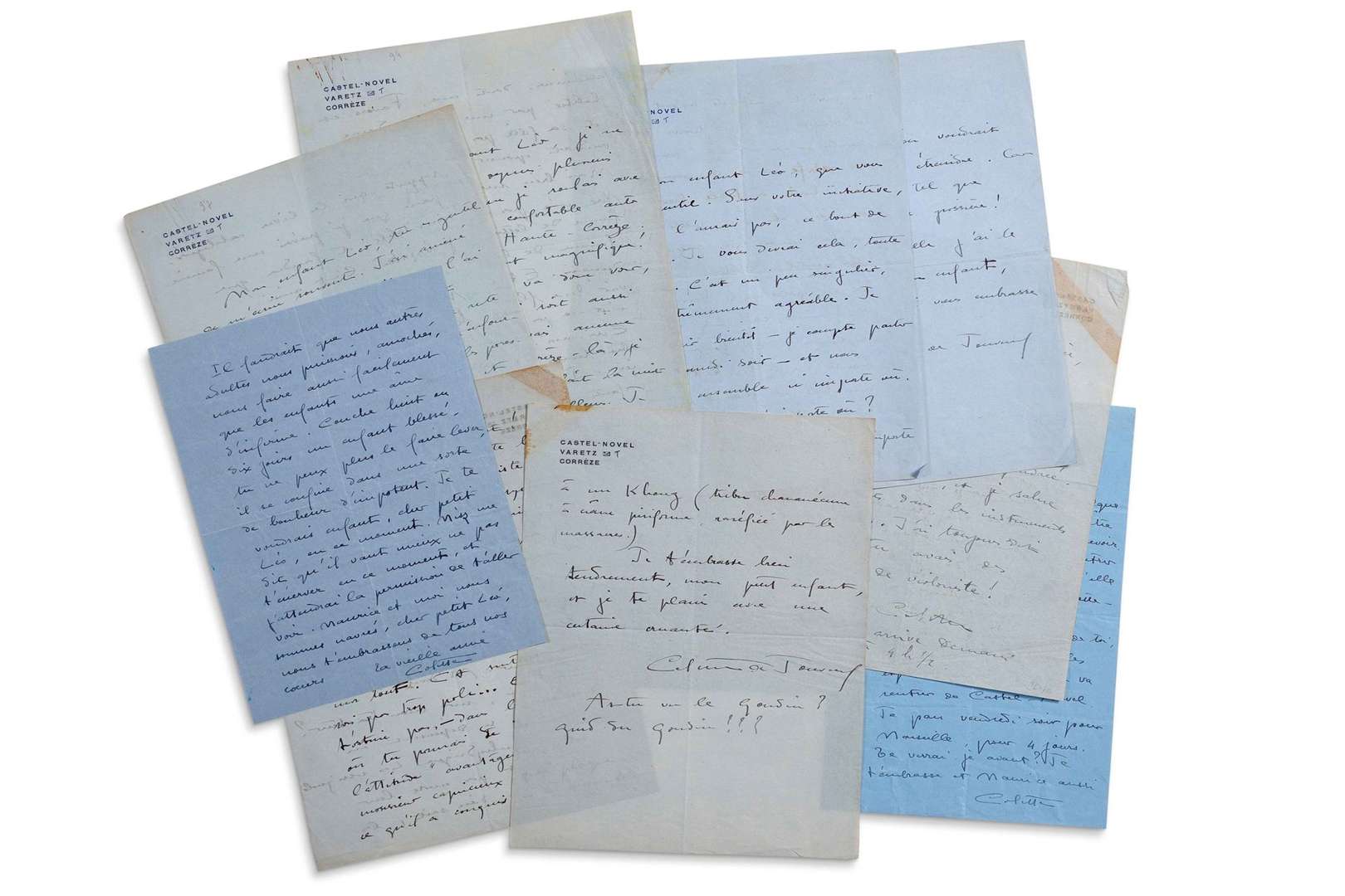 COLETTE (1873 - 1954) 15 L.A.S., 1920-1923 et s.d., à Léopold Marcha nd| env. 32 pages in-4 sur papier bleu, la plupart à en-tête de Castel-Novel, 11 enveloppes (défauts à la 1ère).
