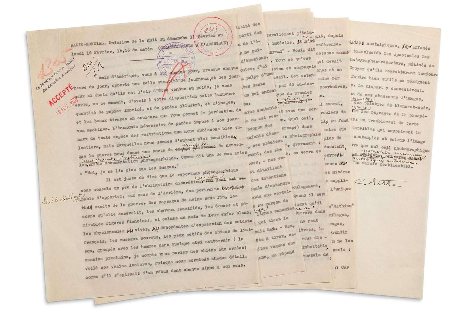 COLETTE (1873 - 1954) TAPUSCRIT signé « Colette » avec corrections autographes, Colette parle à l'Amérique, 10 février 1940| 5 pages et demie in-4, cachet de la censure Contrôle Radio Diffusion.