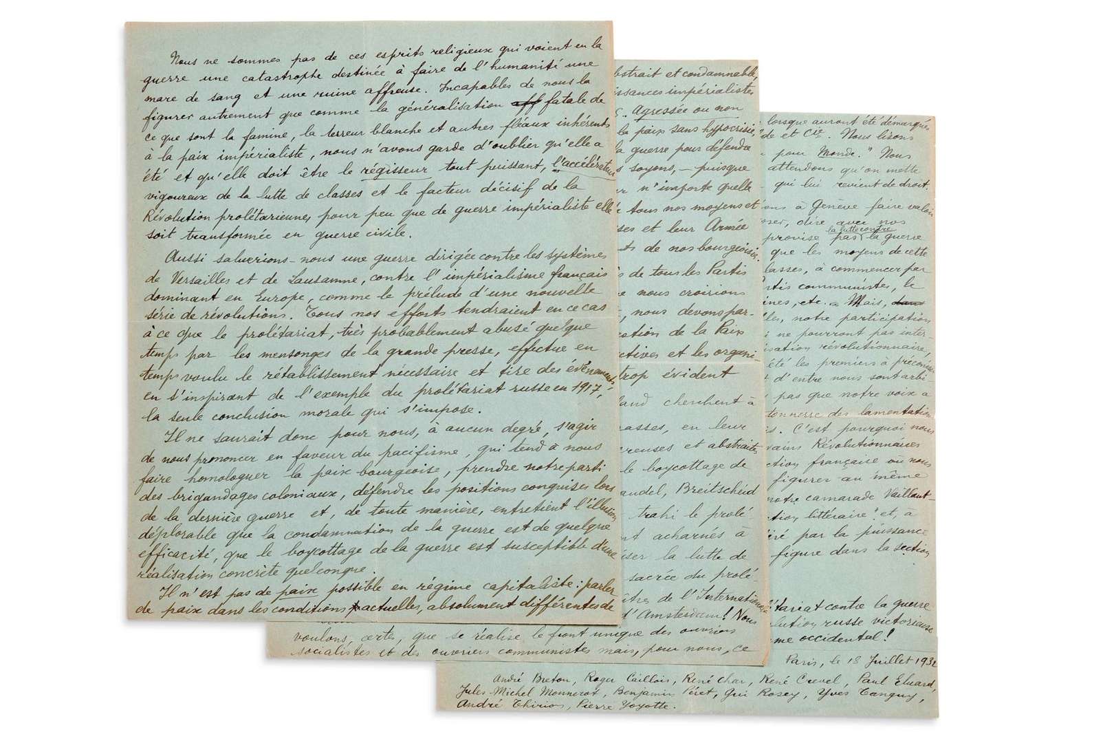ELUARD Paul (1895 - 1952) MANUSCRIT autographe signé « Paul Eluard », Paris 18 juillet 1932| 3 pages in-4 sur papier bleu.
