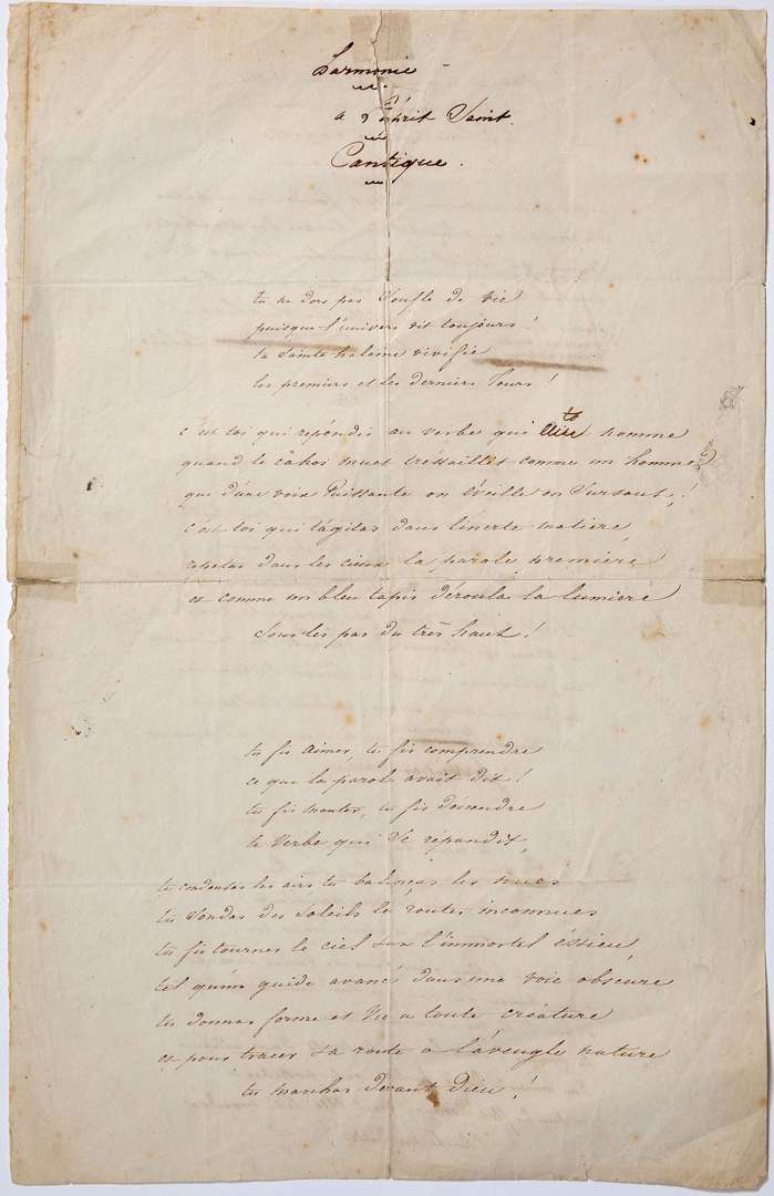 LAMARTINE Alphonse de (1790 - 1869) POÈME autographe, Harmonie. à L'esprit Saint. Cantique| 2 pages in-fol. (fentes à 3 pliures réparées au scotch).