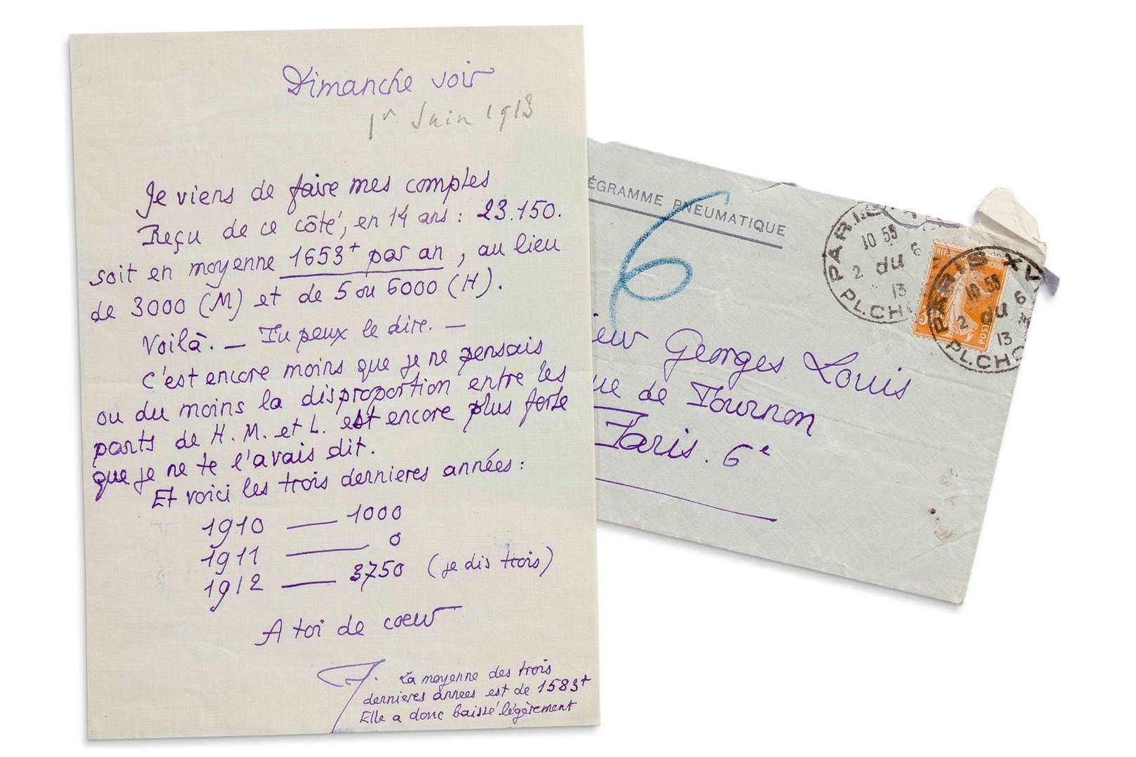 et L. [Hélène, Marie et Louise] est encore plus forte que je ne te l'avais dit. Et voici les trois dernières années: 1910 -- 1000 1911 -- 0 1912 -- 3750 [...] La moyenne des trois dernières années est de 1583 f. Elle a donc baissé légèrement »