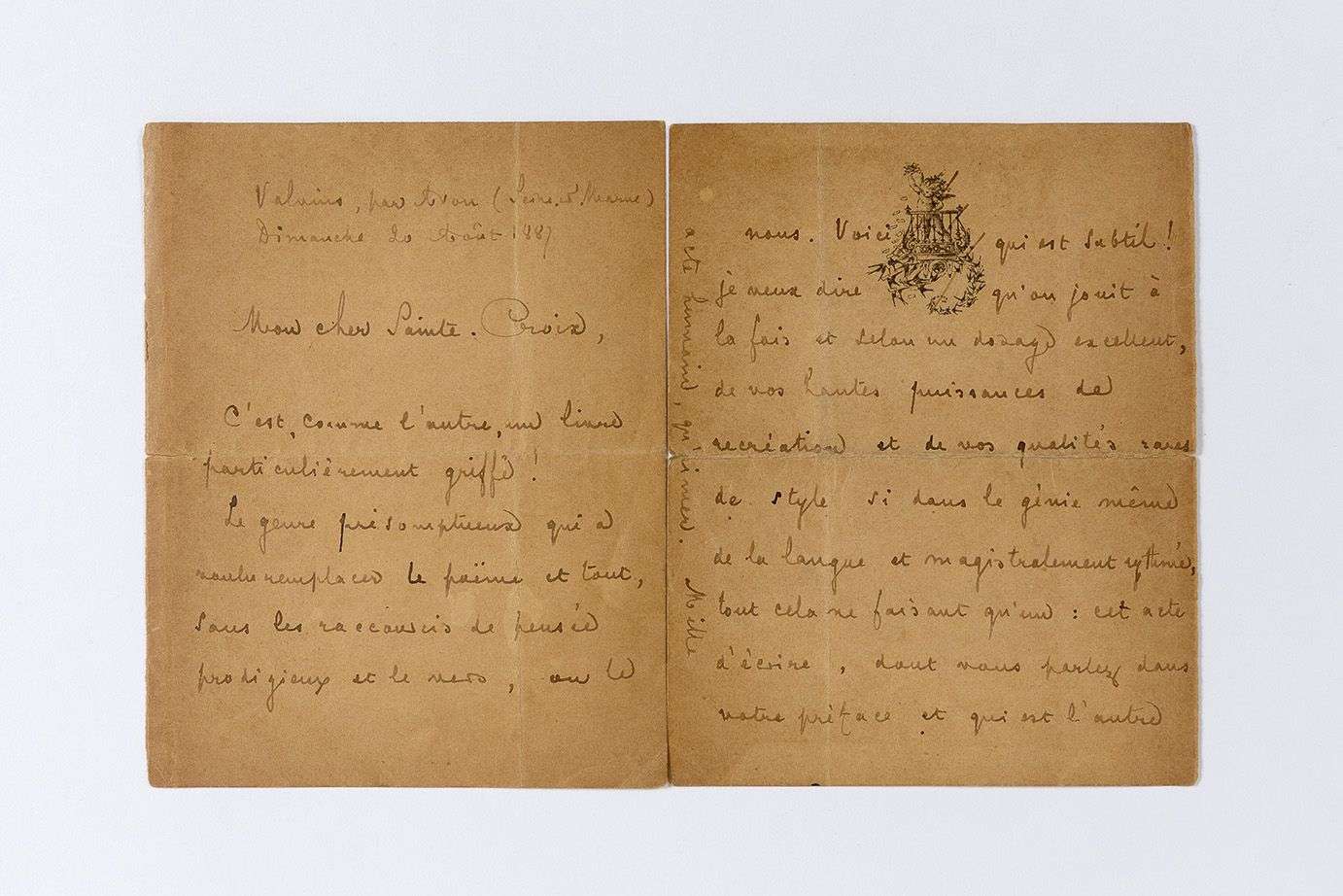 MALLARMÉ Stéphane (1842 - 1898) L.A.S. « Stéphane Mallarmé », Valvins 20 août 1887, à Camille de SAINTE-CROIX| 4 pages in-8 avec vignette à la dernière page (papier bruni, quelques fentes et marques de plis).