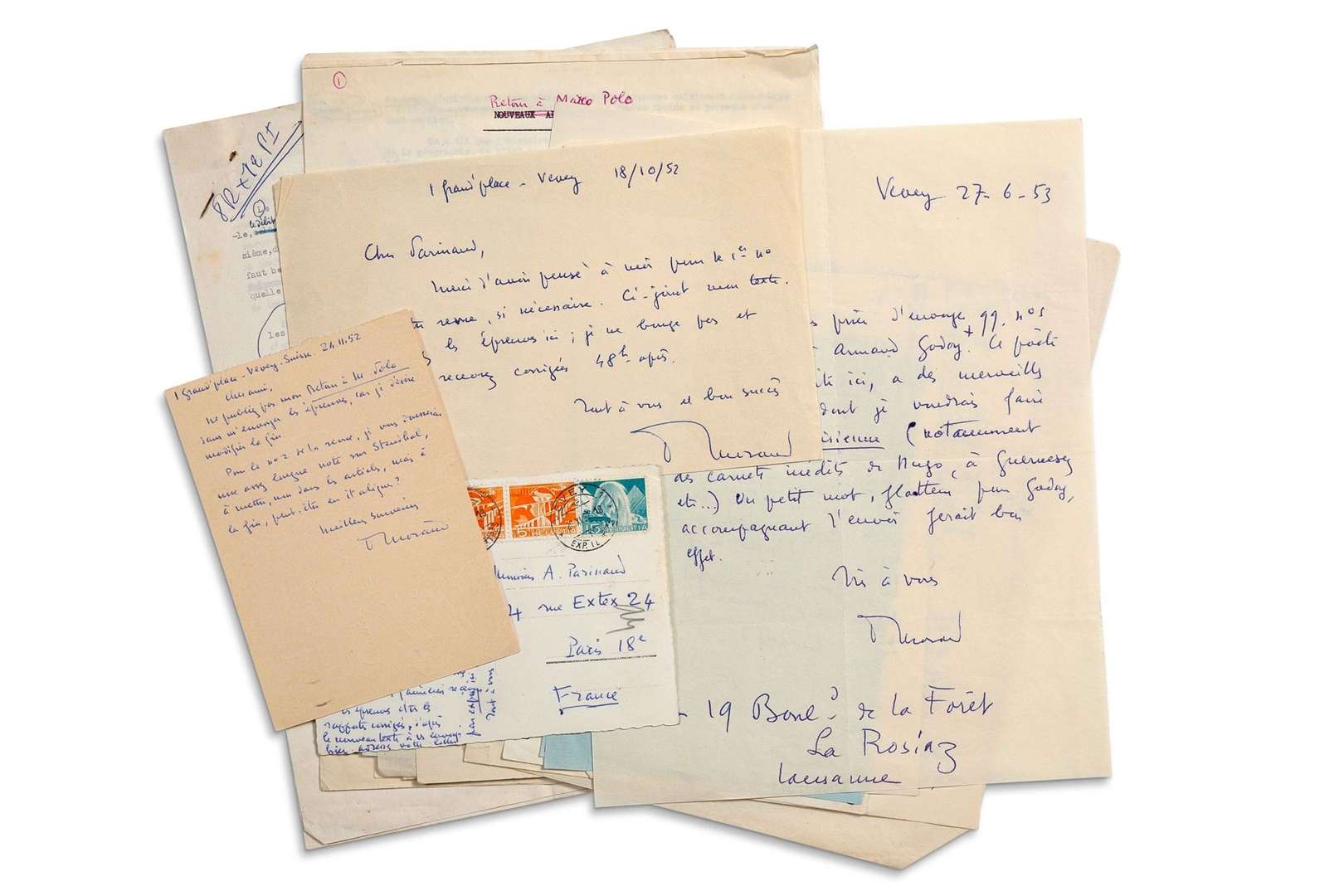MORAND Paul (1888 - 1976) 19 L.A.S., 1952-1962, à André PARINAUD, et 2 TAPUSCRITS corrigés et signés| 19 pages formats divers, quelques enveloppes, et 5 pages in-4.