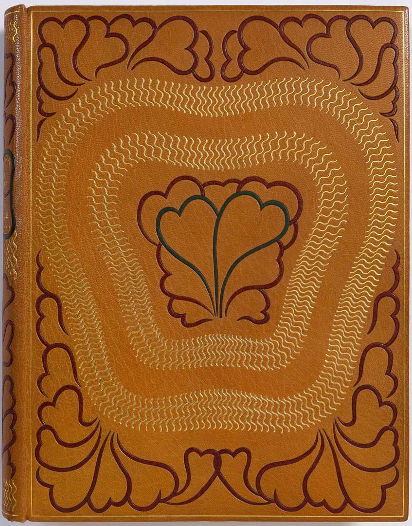 NOAILLES Anna de (1876 - 1933) Le Coeur innombrable, avec des pastels de l'auteur gravés sur bois par DARAGNÈS (Paris, Librairie des Champs-Élysées, 1931), 1931. In-fol., relié maroquin fauve, dos lisse, large décor mosaïqué polychrome avec filets, dorés ondés sur les plats et le dos, doublures et gardes de daim marron, encadrement intérieur de motifs mosaïqués et de filets dorés ondés, tranches dorées, couvertures et dos, chemise doublée à dos et recouvrements de maroquin fauve (le dos orné comme les plats), étui accidenté (Mad. Gras).