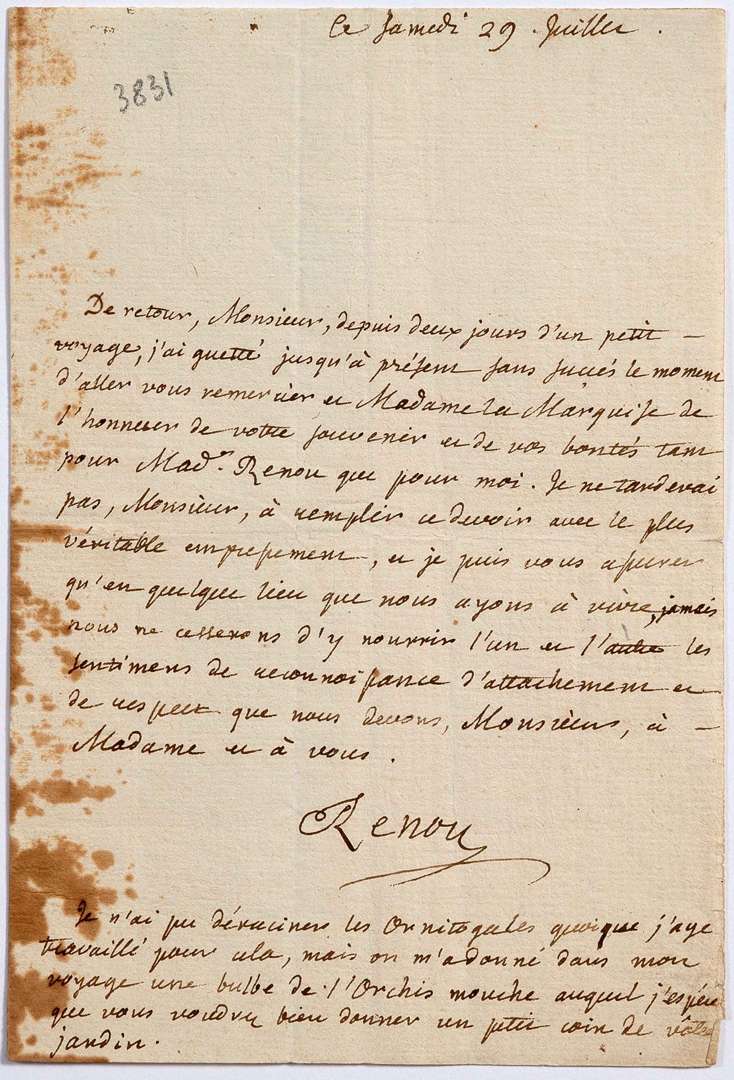 Madame la Marquise de l'honneur de votre souvenir et de vos bontés tant pour Made Renou que pour moi. Je ne tarderai pas, Monsieur, à remplir ce devoir avec le plus véritable empressement »...