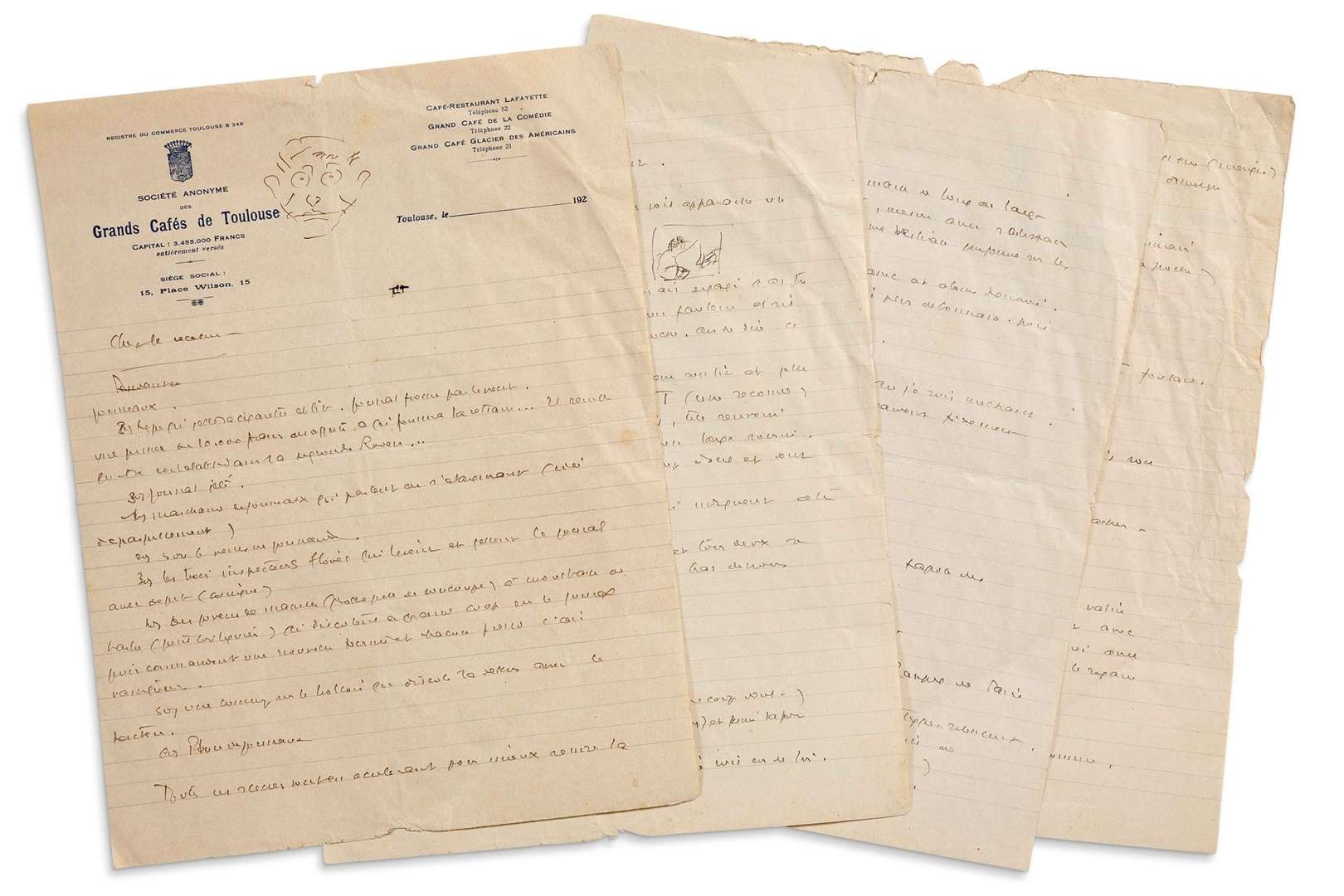 SAINT-EXUPÉRY Antoine de (1900 - 1944) MANUSCRIT autographe, Chez le receleur, [vers 1927]| 4 pages sur 4 feuillets in-4 à en-tête des Grands Cafés de Toulouse.