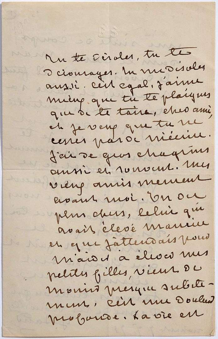 Tu te désoles, tu te décourages, tu me désoles aussi. C'est égal, j'aime mieux que tu te plaignes que de te taire, cher ami, et je veux que tu ne cesses pas de m'écrire. J'ai de gros chagrins aussi et souvent. Mes vieux amis meurent avant moi. Un des plus chers [Jules BOUCOIRAN], celui qui avait élevé Maurice et que j'attendais pour m'aider à élever mes petites-filles, vient de mourir presque subitement. C'est une douleur profonde. La vie est une suite de coups dans le coeur. Mais le devoir est là: il faut marcher et faire sa tâche sans contrister ceux qui souffrent avec nous. - Je te demande absolument de vouloir et de ne pas être indifférent aux peines que nous partageons avec toi. Dis-nous que le calme s'est fait et que l'horizon s'est éclairci. Nous t'aimons, triste ou gai »...