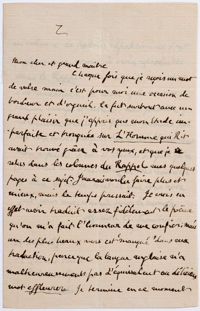Ce fut surtout avec un grand plaisir que j'appris que mon étude imparfaite et tronquée sur L'Homme qui rit avait trouvé grâce à vos yeux, et que je relus dans les colonnes du Rappel mes quelques phrases à ce sujet. J'aurais voulu faire plus et mieux, mais le temps pressait. Je crois en effet avoir traduit assez fidèlement le poëme qu'on m'a fait l'honneur de me confier| mais un des plus beaux vers est “manqué” dans ma traduction, parce que la langue anglaise n'a malheureusement pas d'équivalent au délicieux mot effleurer.