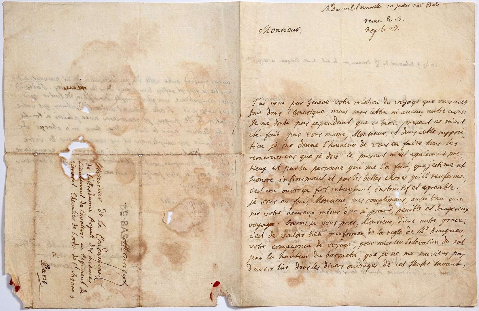 BERNOULLI Daniel (1700 - 1782) physicien. L.A.S. « Daniel Bernoulli », Bâle 10 juillet 1746, à Charles de LA CONDAMINE| 3 pages in-4, adresse (mouillures et petits trous avec perte de quelques mots).