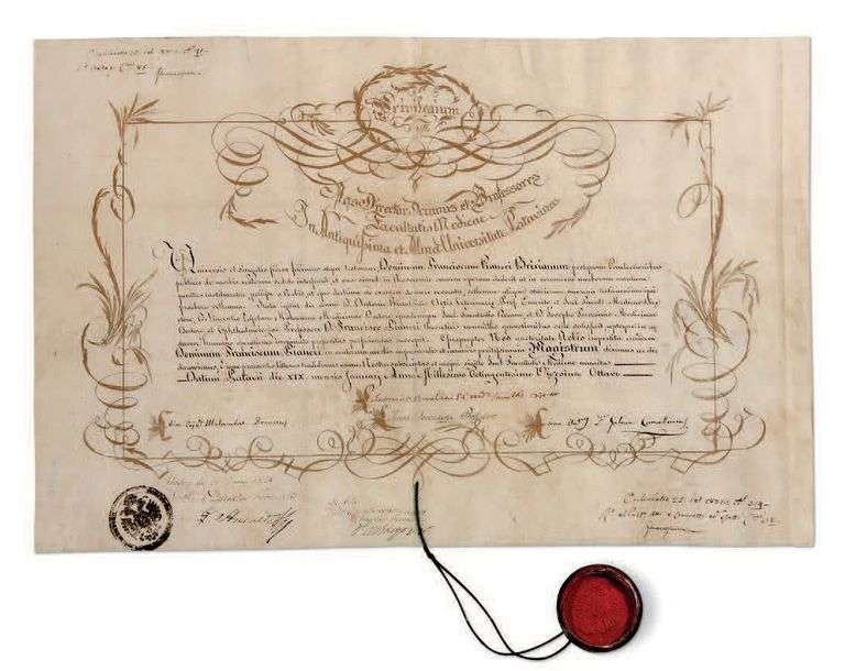 Beau diplôme de doctorat en chirurgie pour le medecin Francesco PIANERI de Brixen, signé par Gallini comme recteur de l'université de Padoue| cosigné par le directeur de la Faculté de Medecine Antonio RINALDINI, le doyen Vincenzo MALACARNE (1744-1816), le chancelier Giovanni Antonio GALVANI, etc.
