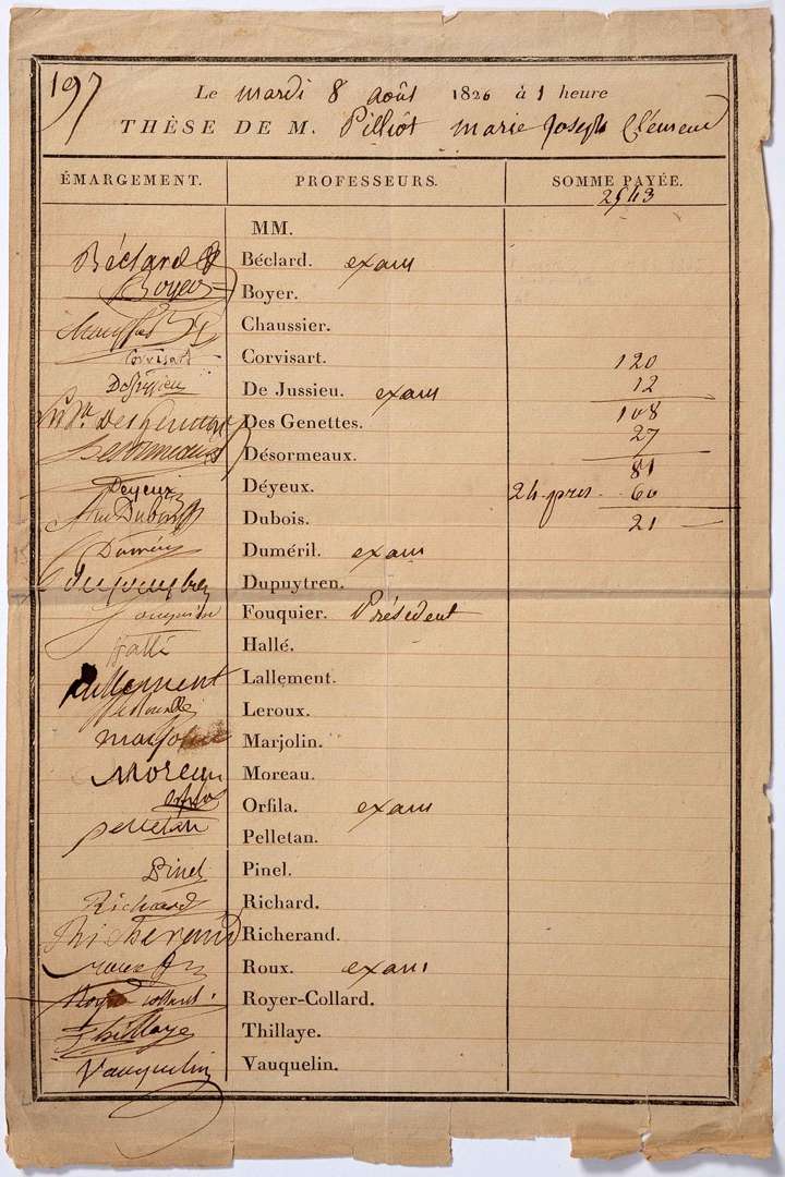 Soutenance de thèse de Marie Joseph Clément PILLIOT le 8 août 1826. La page est divisée en trois colonnes| dans la première, titrée Émargement, les signatures ont été apposées face aux noms imprimés dans la 2e colonne, Professeurs, parmi lesquels: Béclar d, Cor visar t, Desgenettes, Dubo is, Dupuytren, Hall é, Juss ieu, Marjol in, Orf ila, Pell etan, Pinel, Royer-Collar d, Vauquelin, etc. La 3e colonne indique la Somme payée
