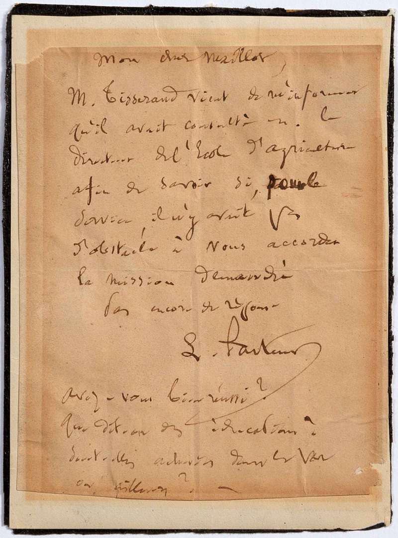 Tisserand vient de l'informer qu'il avait consulté le directeur de l'École d'agriculture « afin de savoir si, pour le dossier, il n'y avait pas d'obstacle à nous accorder la mission demandée »| il attend la réponse. En post-scriptum, Pasteur demande à Maillot, à propos des vers à soie: « Avez-vous bien réussi ? Que dit-on des éducations ? Sont-elles achevées dans le Var ou ailleurs ? »