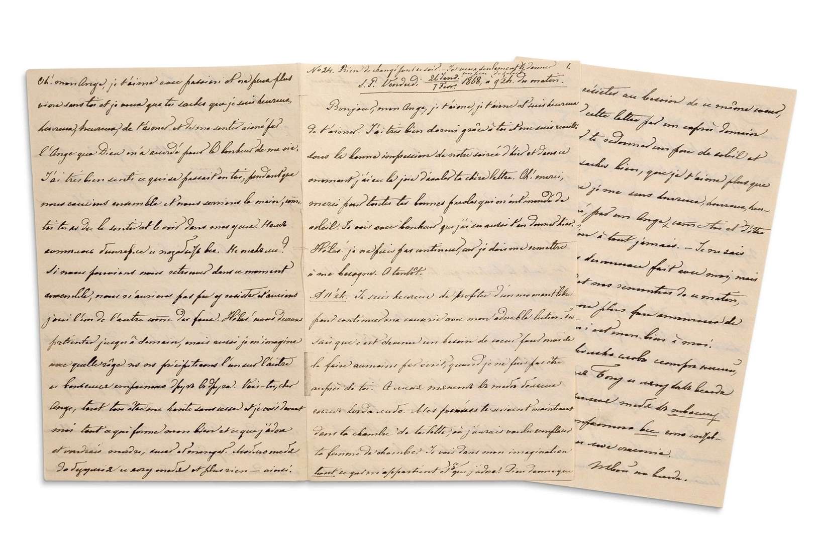 L'après-midi: « Nous devons avouer que nos rencontres nous ont réussi en plein aujourd'hui, et je sens que nous sommes plus fous que jamais l'un de l'autre [...] Je dois t'avouer aussi, cher adorable lutin que j'ai la rage de nos bingerles [leurs ébats érotiques] et demain coûte que coûte nous devons nous retrouver. Pardonnes moi d'être si déraisonable, mais tu n'as qu'à t'en prendre à toimeme, car c'est toi seule qui m'as rendu une telle ?? ????, comme si je n'avais que 20 ans. Oh ! mon Ange, je t'aime avec passion et ne peux plus vivre sans toi et je veux que tu saches que je suis heureux, heureux, heureux, de t'aimer et de me sentir aimé par l'Ange que Dieu m'a accordé pour le bonheur de ma vie. [...] Si nous pouvions nous retrouver dans ce moment ensemble, nous n'aurions pas pu y résister et aurions joui l'un de l'autre comme des fous. Hélas ! nous devrons patienter jusqu'à demain, mais aussi je m'imagine avec quelle rage ns ns précipiterons l'un sur l'autre »... Etc