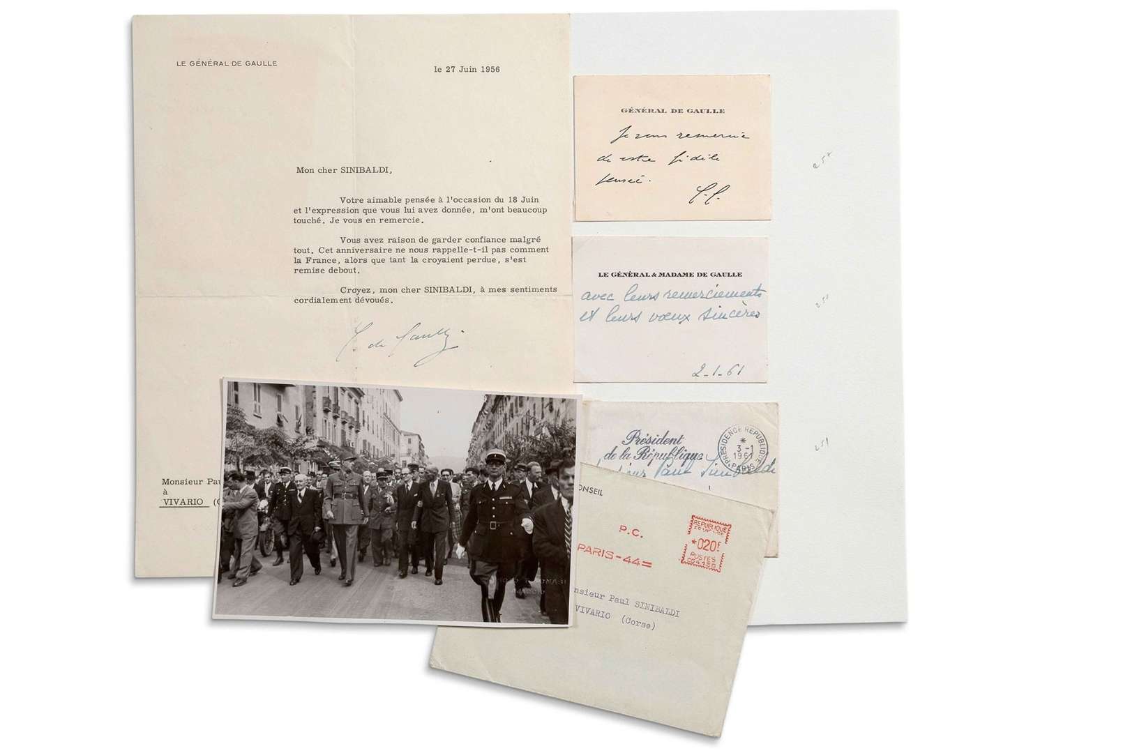On joint une photographie du général en visite à Ajaccio en 1948| plus 2 cartes de visite, une en fac-similé, l'autre écrite par