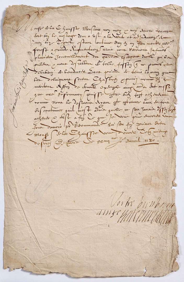 Katerine de Cleves », Paris 24 avril 1580, à M. de La Chaussée, « Gouverneur de mon Comté d'Eu »| 1 page in-fol., adresse au dos.