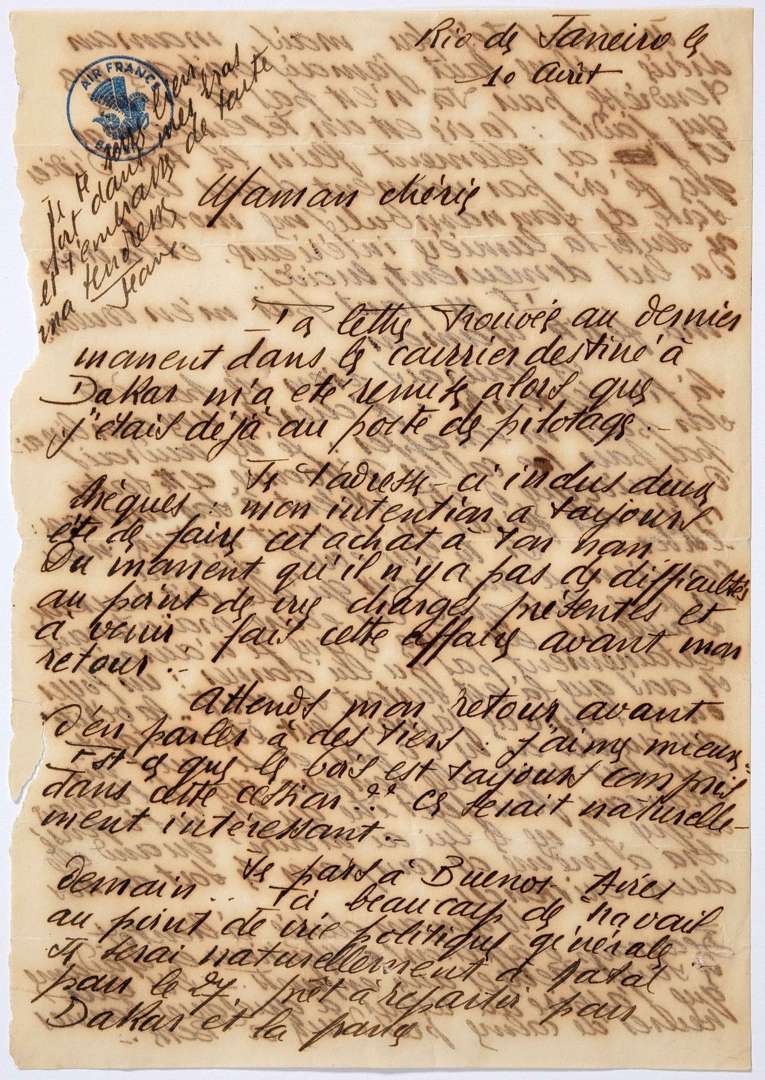 MERMOZ Jean (1901 - 1936) aviateur L.A.S. « Jean », Rio de Janeiro 10 août [1934], à SA MÈRE Gabrielle MERMOZ| 2 pages in-8, vignette Air France Brasil.